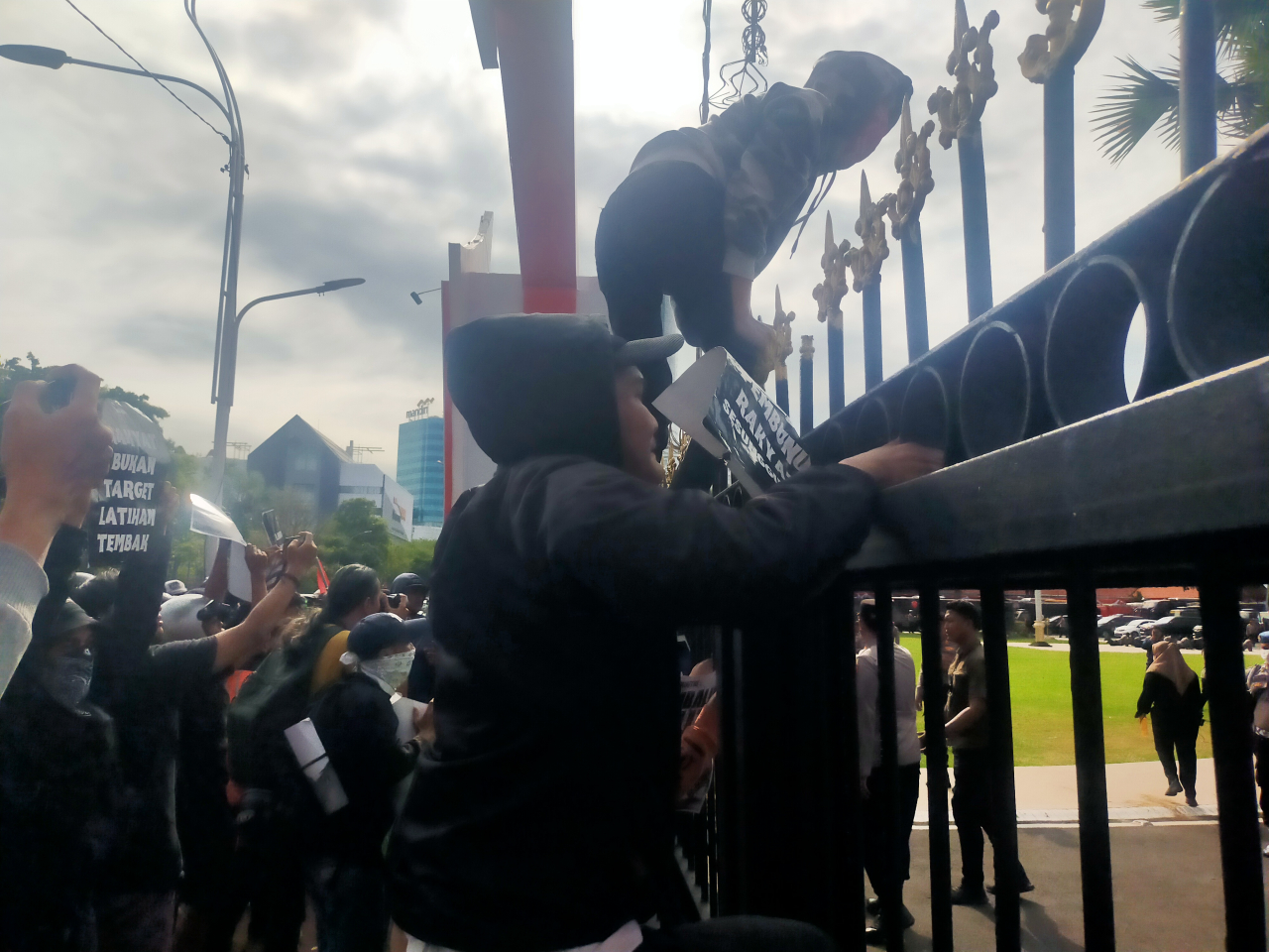 Namun, sekitar pukul 14.35 WIB, situasi berubah drastis menjadi anarkis. Massa yang tidak terkendali mulai membakar 25 unit sepeda motor, melempari aparat keamanan dengan batu, dan berusaha merangsek masuk ke halaman gedung pemerintahan Provinsi Jawa Timur.