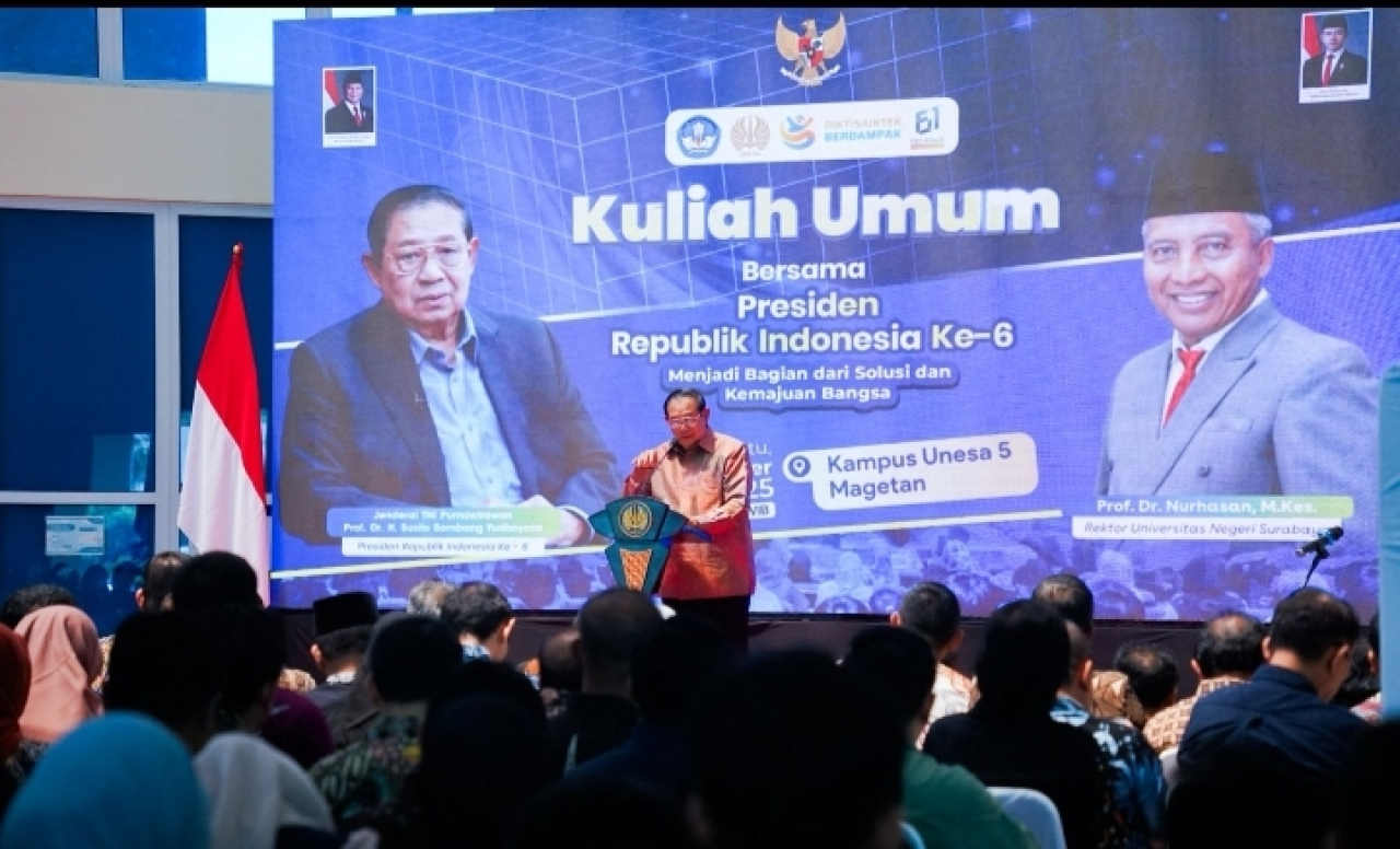 Kuliah umum yang dihadiri jajaran pimpinan Unesa, Bupati Magetan, dan pimpinan DPRD Magetan tersebut menjadi momentum bagi SBY untuk mengajak seluruh mahasiswa dan civitas academica Unesa memperkuat kontribusi nyata demi kemajuan Indonesia.