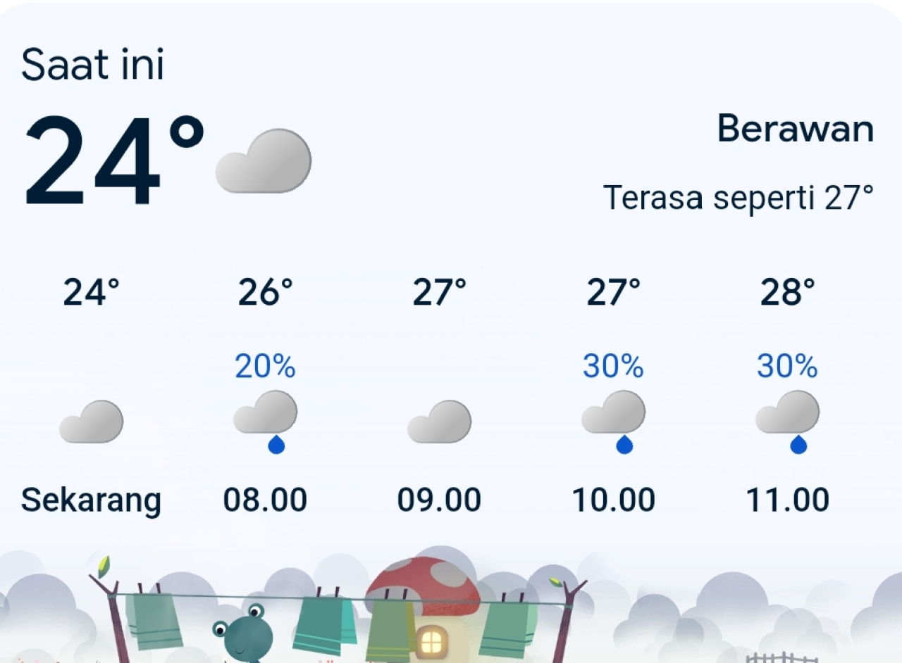 Suhu udara diperkirakan berada di kisaran 23–28°C, sementara kelembapan mencapai 76–96 persen, menandakan atmosfer masih lembap dan mendukung pembentukan awan hujan.