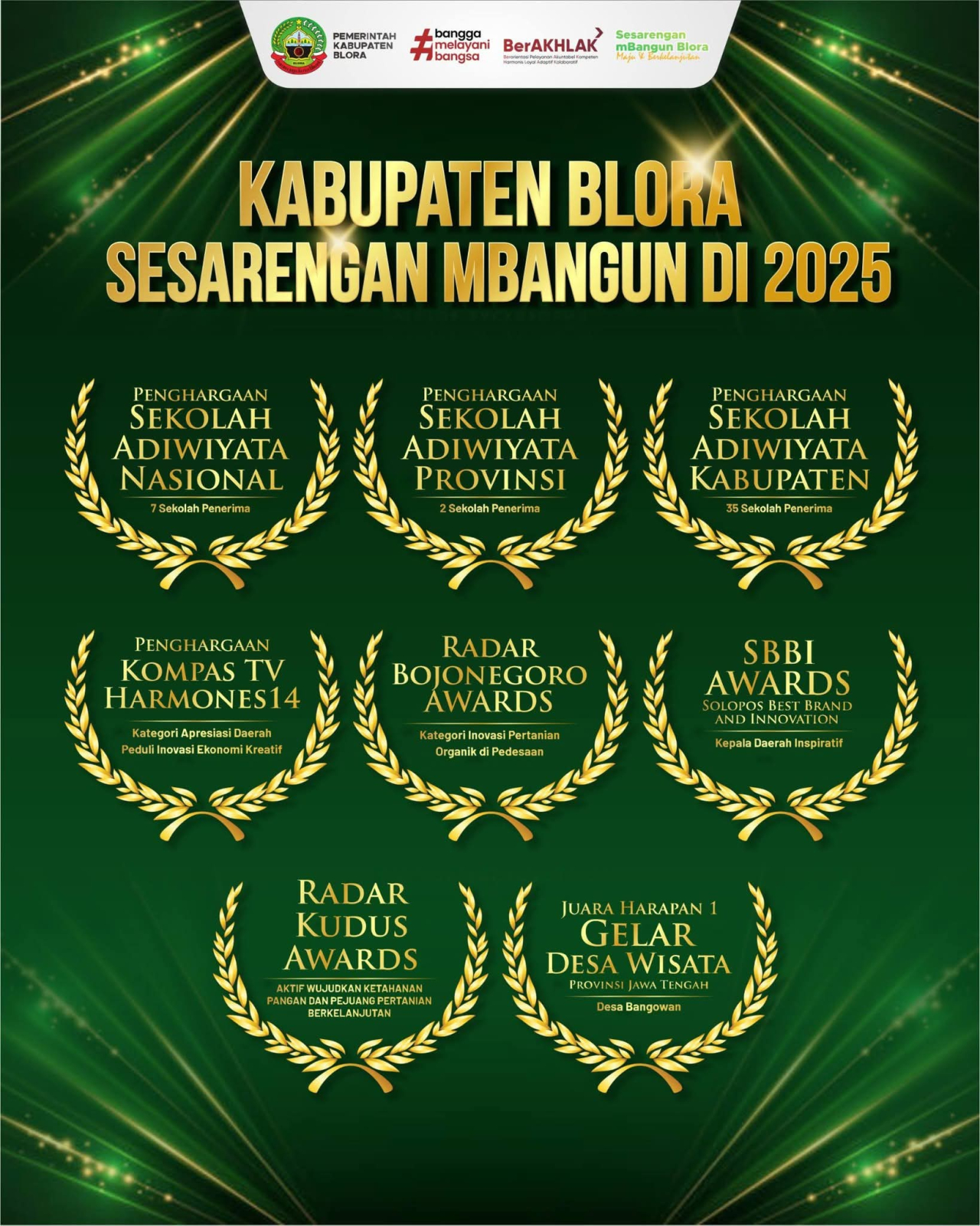 Prestasi lainnya diraih Desa Bangowan yang berhasil menjadi Juara Harapan I Gelar Desa Wisata Provinsi Jawa Tengah, menegaskan potensi desa wisata Blora yang terus berkembang.