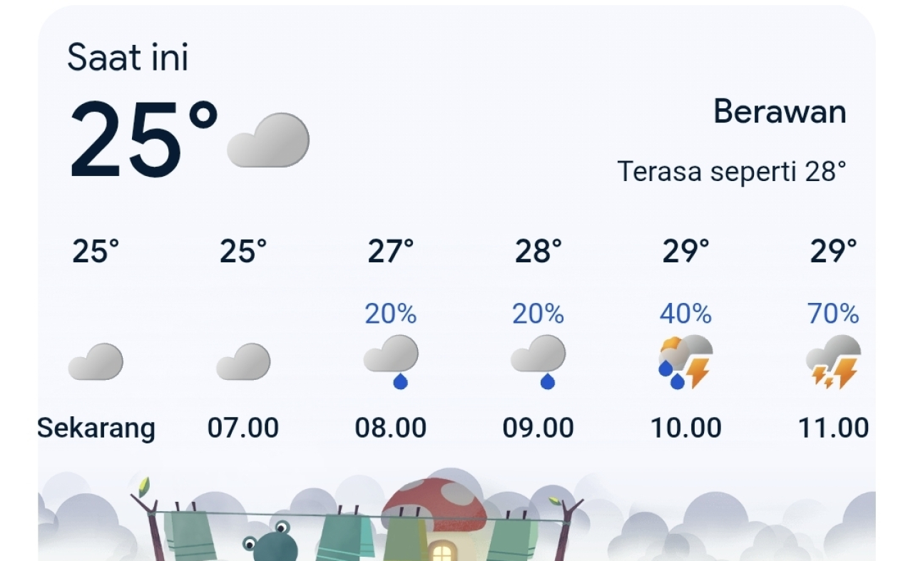 Memasuki siang hari, potensi hujan ringan mulai meningkat. Suhu maksimum diperkirakan mencapai 29 derajat Celsius. Warga yang beraktivitas di luar ruangan diimbau mulai bersiap dengan perlengkapan pelindung hujan, seperti payung atau jas hujan.