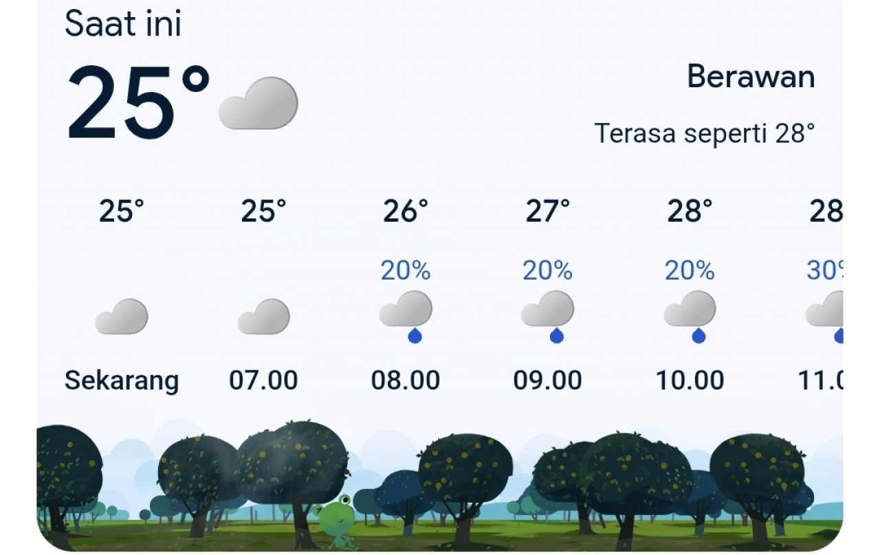 Memasuki pagi hingga menjelang siang, hujan ringan diperkirakan mulai turun secara merata. Pada rentang waktu pukul 07.00 hingga 12.00 WIB, suhu udara meningkat hingga 28 derajat Celsius, dengan peluang hujan ringan berkisar antara 20 hingga 30 persen. Kondisi ini membuat udara terasa cukup lembap, meski aktivitas masyarakat masih dapat berjalan seperti biasa.
