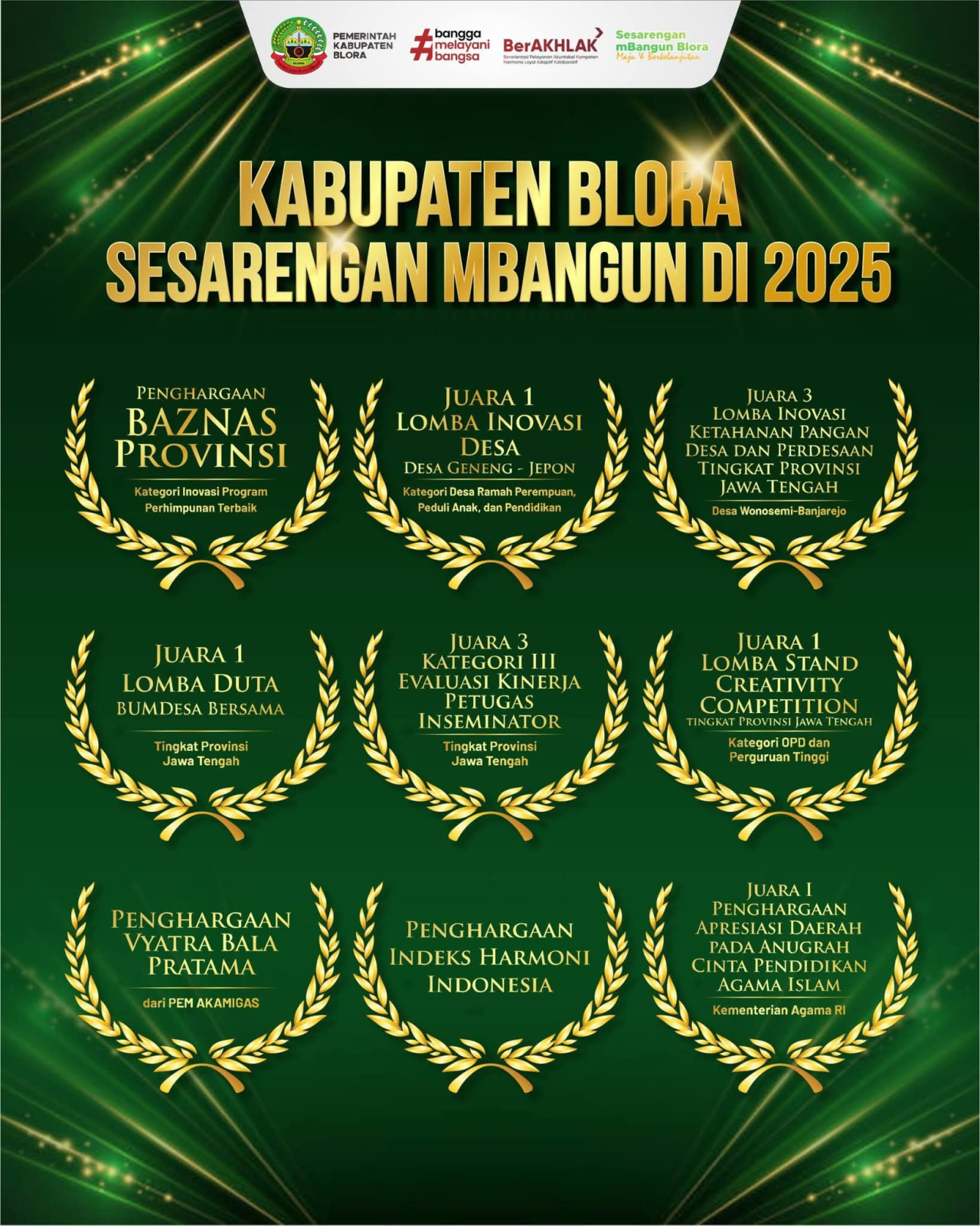 Sepanjang 2025, Kabupaten Blora mencatatkan sejumlah penghargaan strategis, di antaranya Penghargaan BAZNAS Provinsi Jawa Tengah untuk kategori Inovasi Program Perhimpunan Terbaik, yang menegaskan komitmen daerah dalam pengelolaan zakat dan program sosial kemasyarakatan.