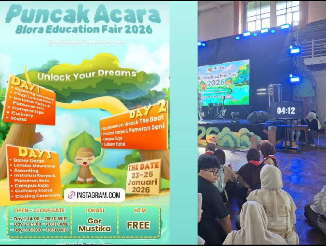 Memasuki hari terakhir, panitia telah menyiapkan beragam agenda menarik. Mulai dari kegiatan donor darah, lomba mewarnai, awarding, pameran seni, hingga closing ceremony yang akan menjadi penutup resmi Blora Education Fair 2026. Seluruh rangkaian acara tersebut dapat dinikmati secara gratis oleh masyarakat.