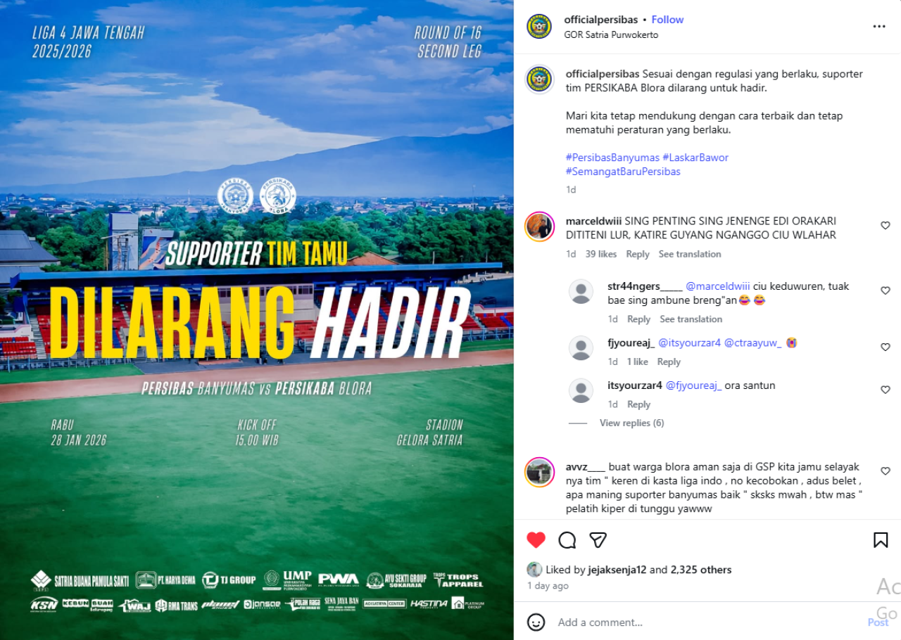 Blora, MEMANGGIL.CO - Manajemen Persibas Banyumas resmi melarang kehadiran suporter tim tamu, Persikaba Blora, pada laga lanjutan Liga 4 Jawa Tengah 2025/2026 babak 16 besar leg kedua yang digelar di GOR Satria Purwokerto, Rabu (28/1/2026).