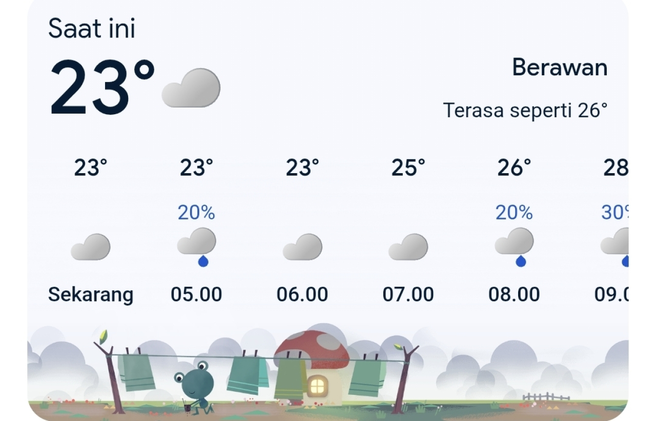 Pada pagi hari, suhu udara berada di kisaran 23 hingga 26 derajat Celcius. Kondisi cuaca relatif berawan, namun hujan ringan sudah mulai berpeluang turun sejak pukul 07.00 WIB. Udara terasa cukup sejuk, dengan suhu terasa mencapai sekitar 26 derajat Celcius.