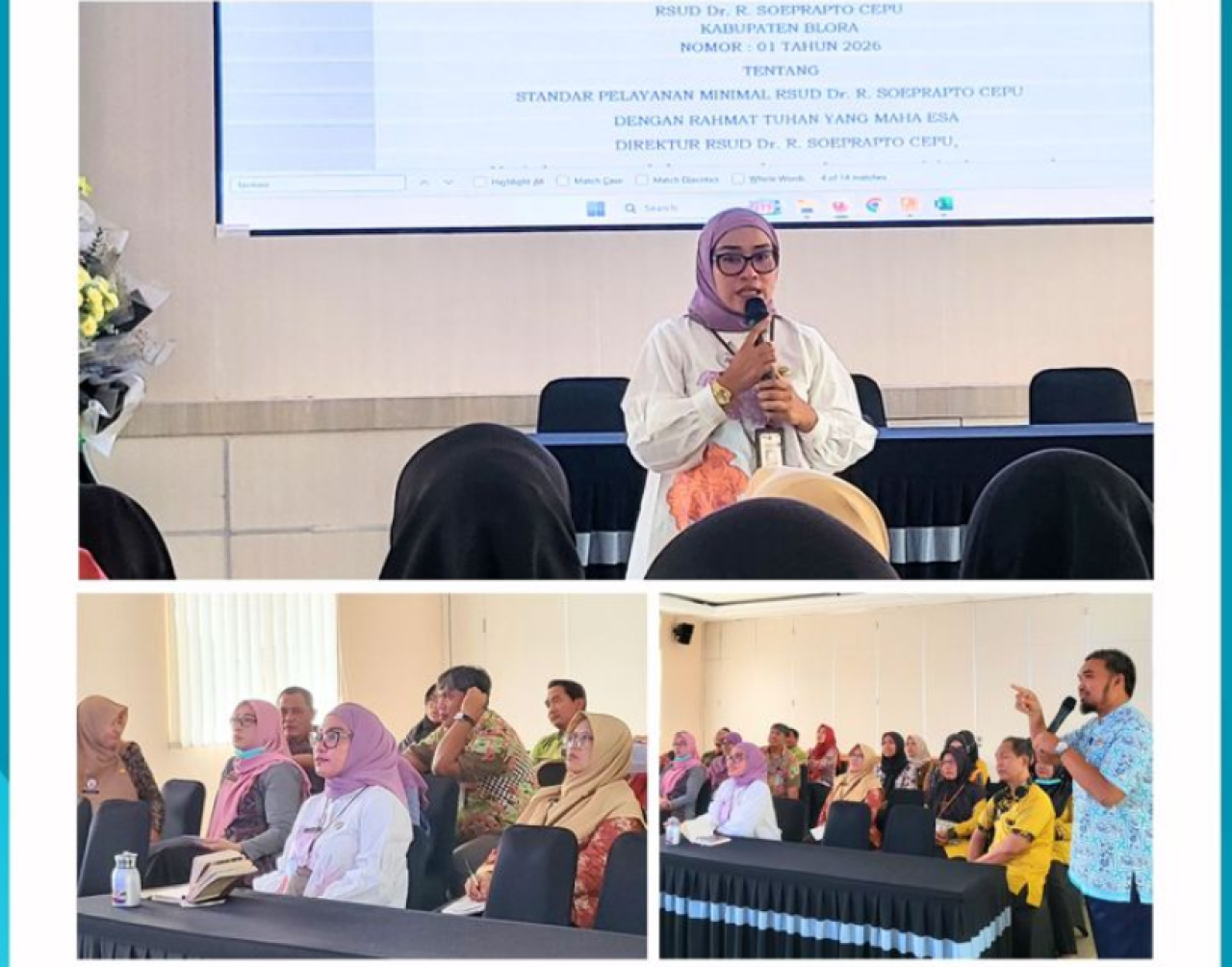 Blora, MEMANGGIL.CO - RSUD dr. R. Soeprapto Cepu menyelenggarakan kegiatan sosialisasi Standar Pelayanan Minimal (SPM) yang dihadiri oleh Direktur, tim manajemen, serta seluruh kepala ruang dan kepala instalasi terkait.