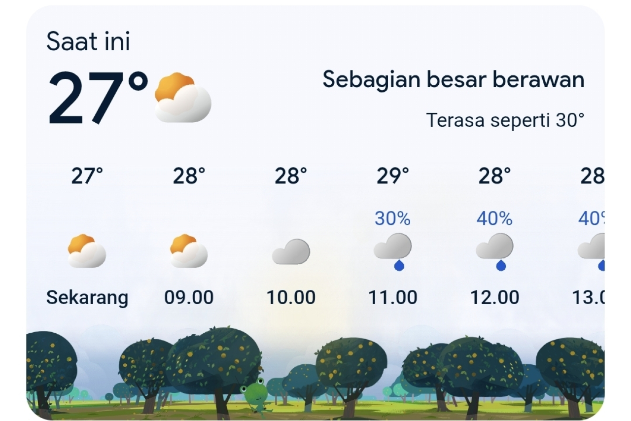 Sementara itu, suhu udara secara bertahap menurun pada sore hingga malam hari, berada di kisaran 26–24 derajat Celsius. Kondisi berawan diperkirakan bertahan hingga dini hari, tanpa potensi cuaca ekstrem yang signifikan.