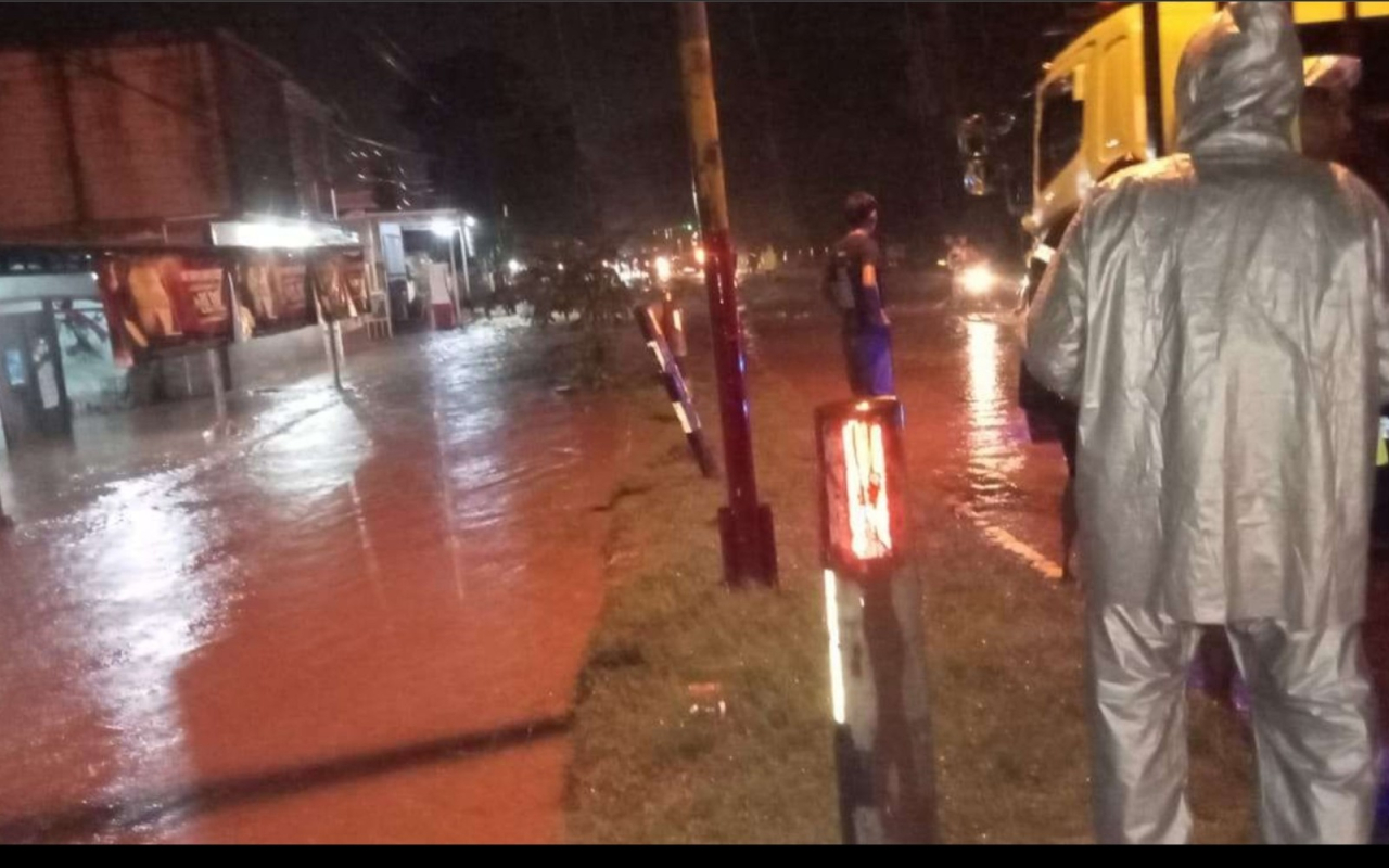 Pantauan di lokasi menunjukkan air mengalir deras dari sisi utara menuju badan jalan nasional. Lampu kendaraan memantul di atas permukaan genangan, memperburuk jarak pandang pengemudi yang sudah terbatas akibat hujan lebat dan minimnya penerangan.